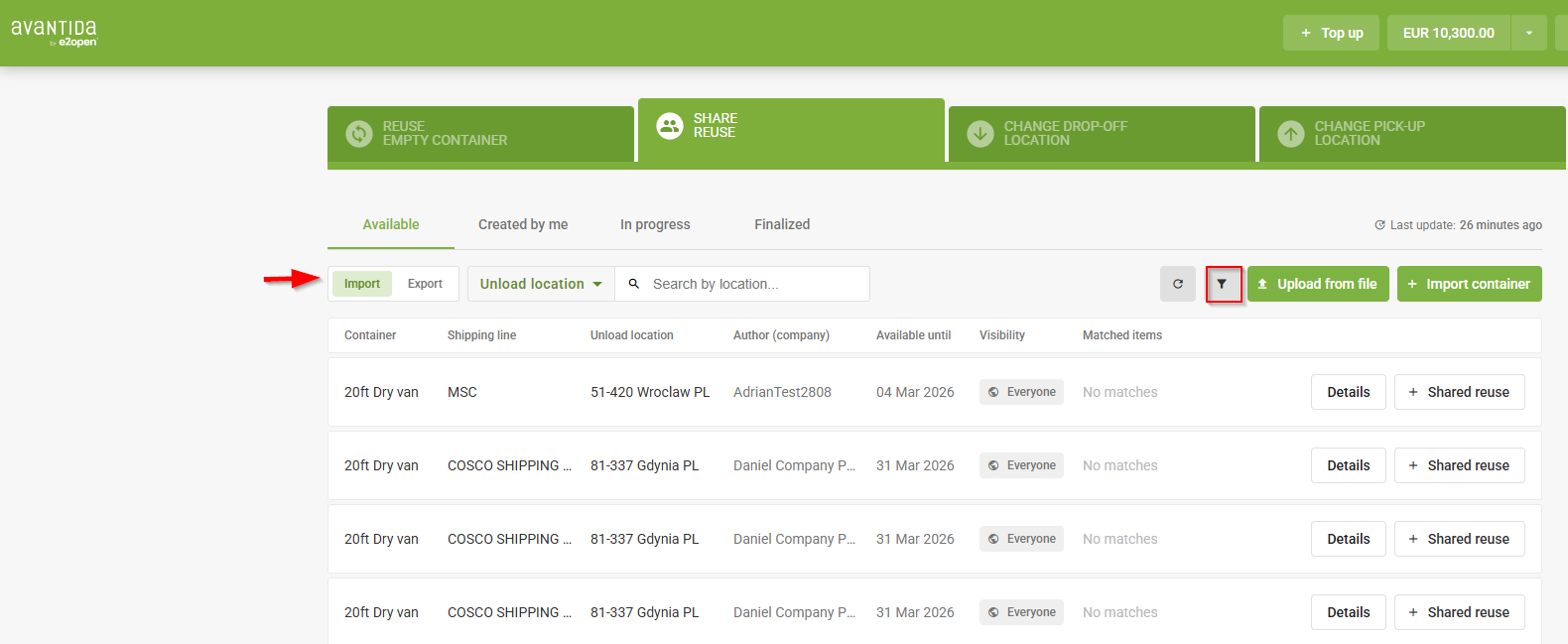 - Selezionando “Importazione” vedrai tutti i container vuoti disponibili.