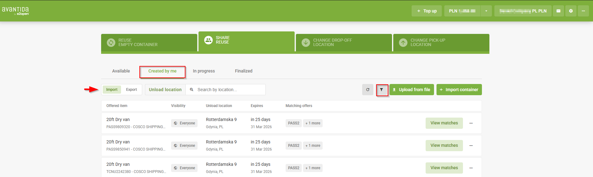 - Nella scheda “Creato da me” puoi vedere tutti i container di importazione offerti e le prenotazioni di esportazione che cercano un container vuoto.