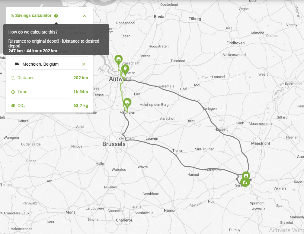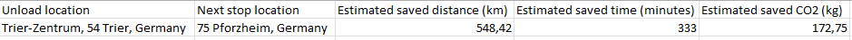 - De alternatieve pick-up locatie vermindert de totaal te rijden afstand met 202 km, wat een besparing oplevert van ongeveer 1 uur en 54 minuten transporttijd. Deze kortere route voorkomt ook ongeveer 63,7 kg CO₂: